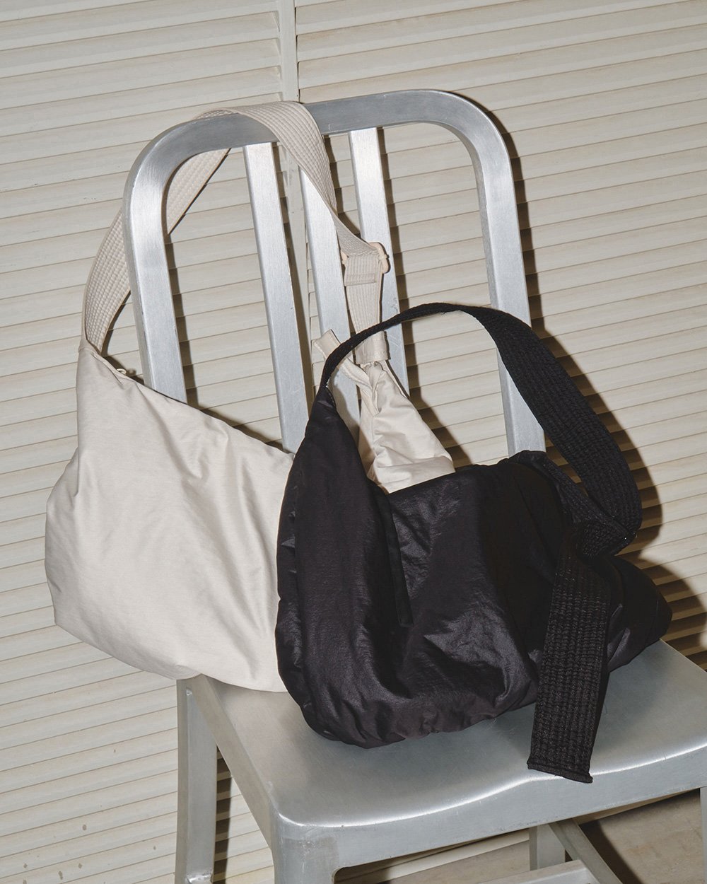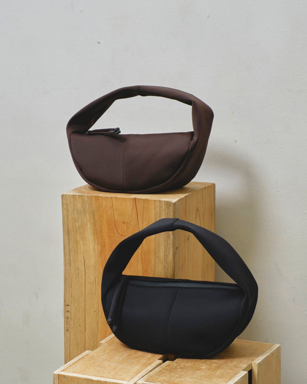 ボンディング加工のダブルフェイス生地を使用したラップバッグ。先端に樹脂コーティングを施したファスナー引き手や、丸みのある立体的なシルエットが魅力。デイリーからオケージョンまで幅広いシーンでお使いいただけます。