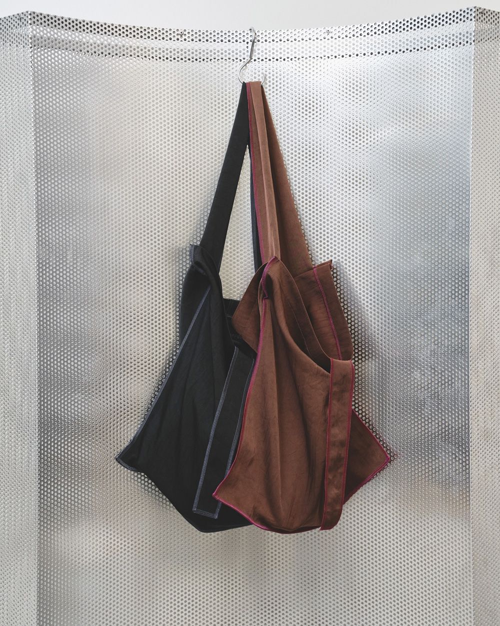 TODAYFULオリジナルカラーで、内側にロゴをあしらった別注のトートバッグ。旅行やマザーズバックとしても使える大きいサイズです。アウターの上からでも斜めに掛けられるところも便利◎ ショルダーストラップは、肩掛けと手持ちの長さに対応。中央のベルトを結んで持つことも可能です。黒字にパープルのステッチで大人なカラーと、スタイリングの差し色になるブラウン×ピンクの2色展開。
