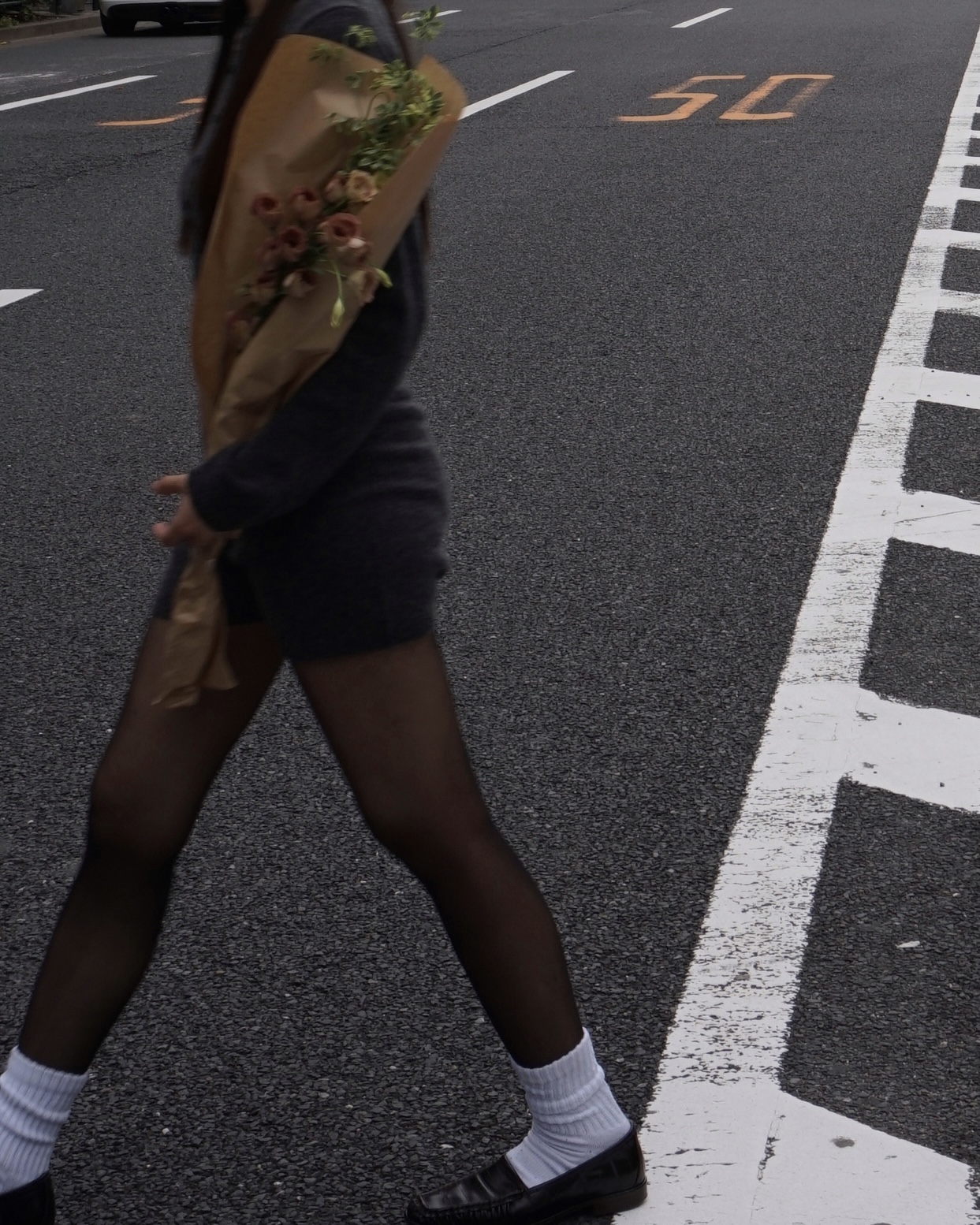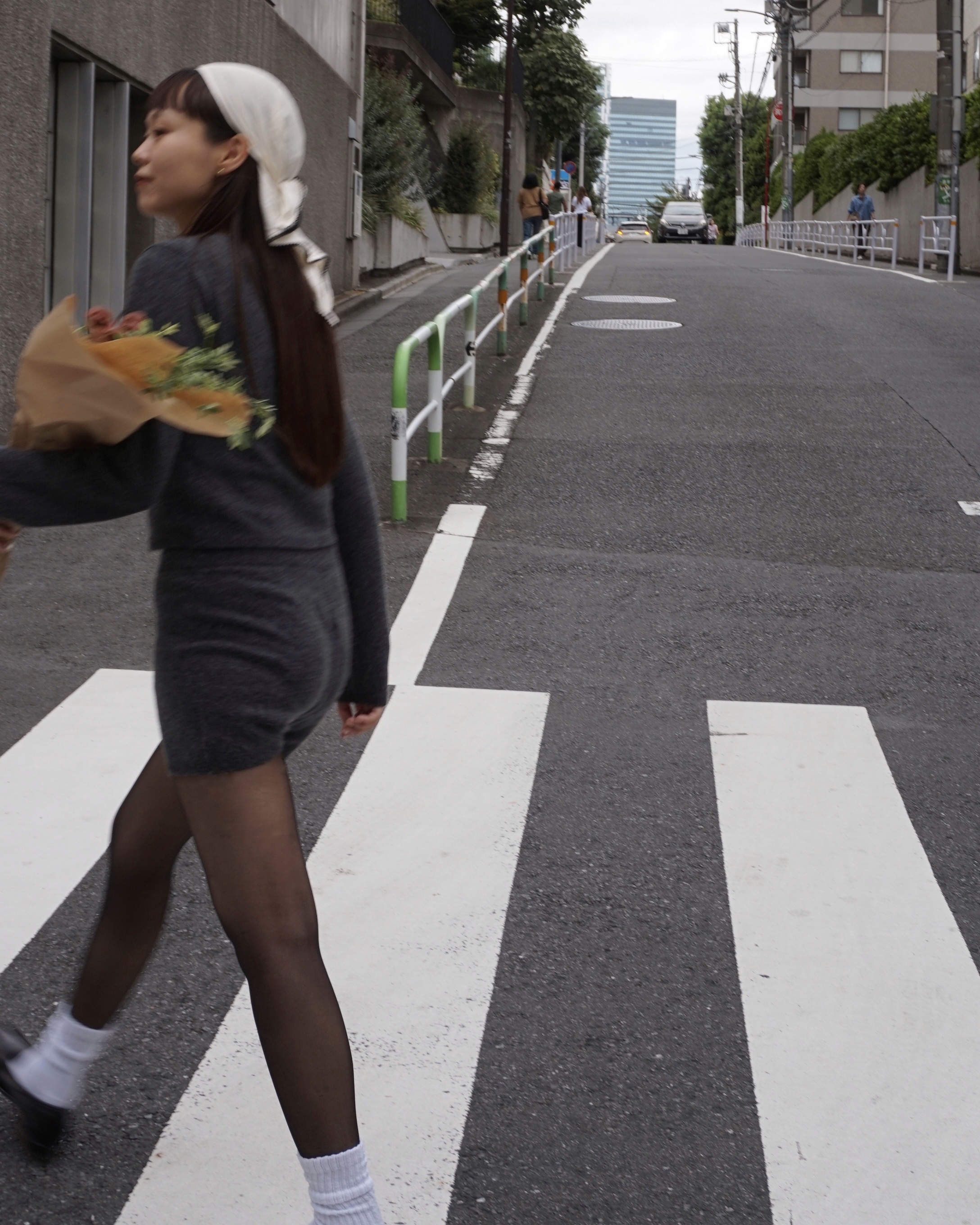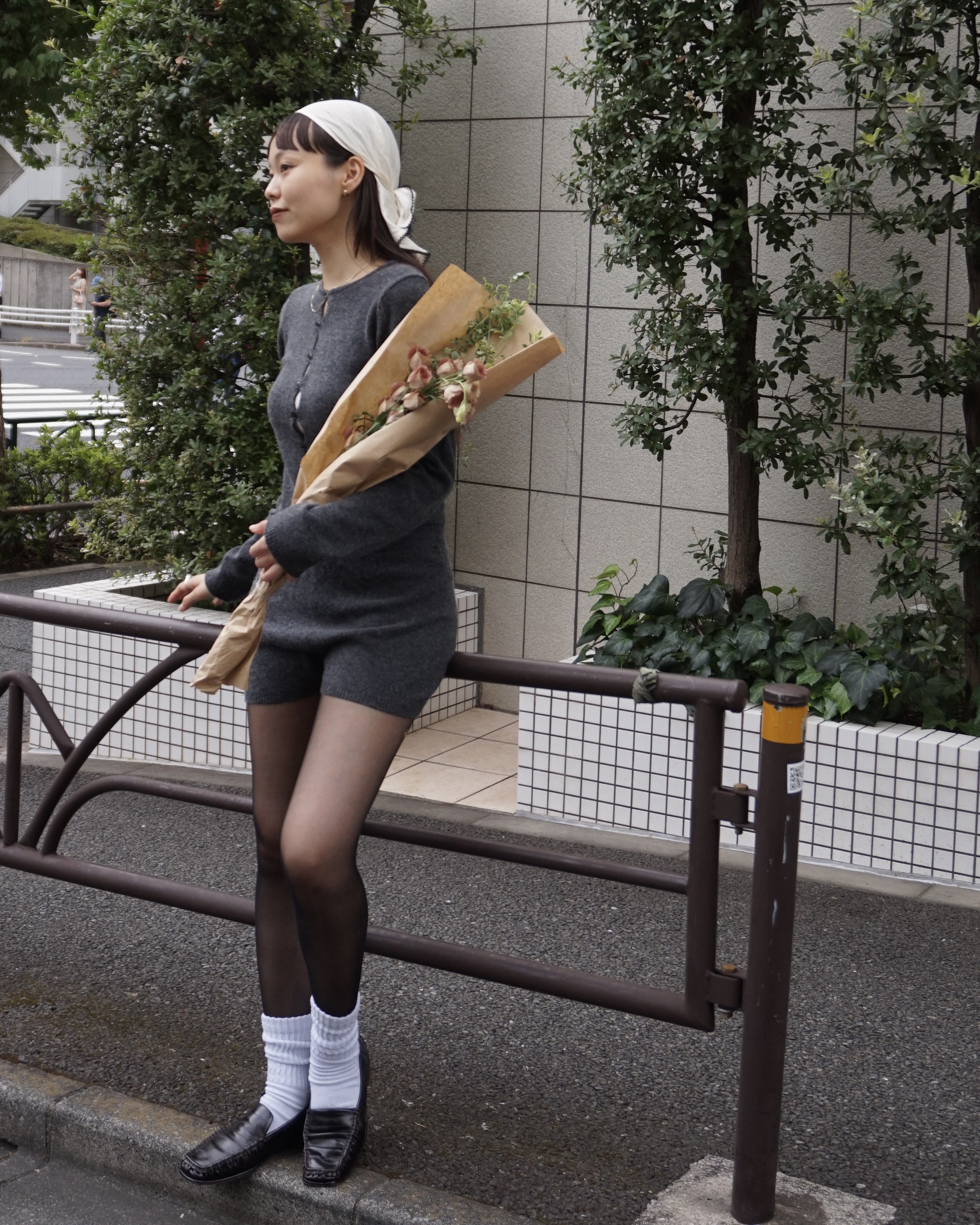 女性らしいセットアップをローファーやソックス、スカーフなどの小物を使用してトレンドを意識。