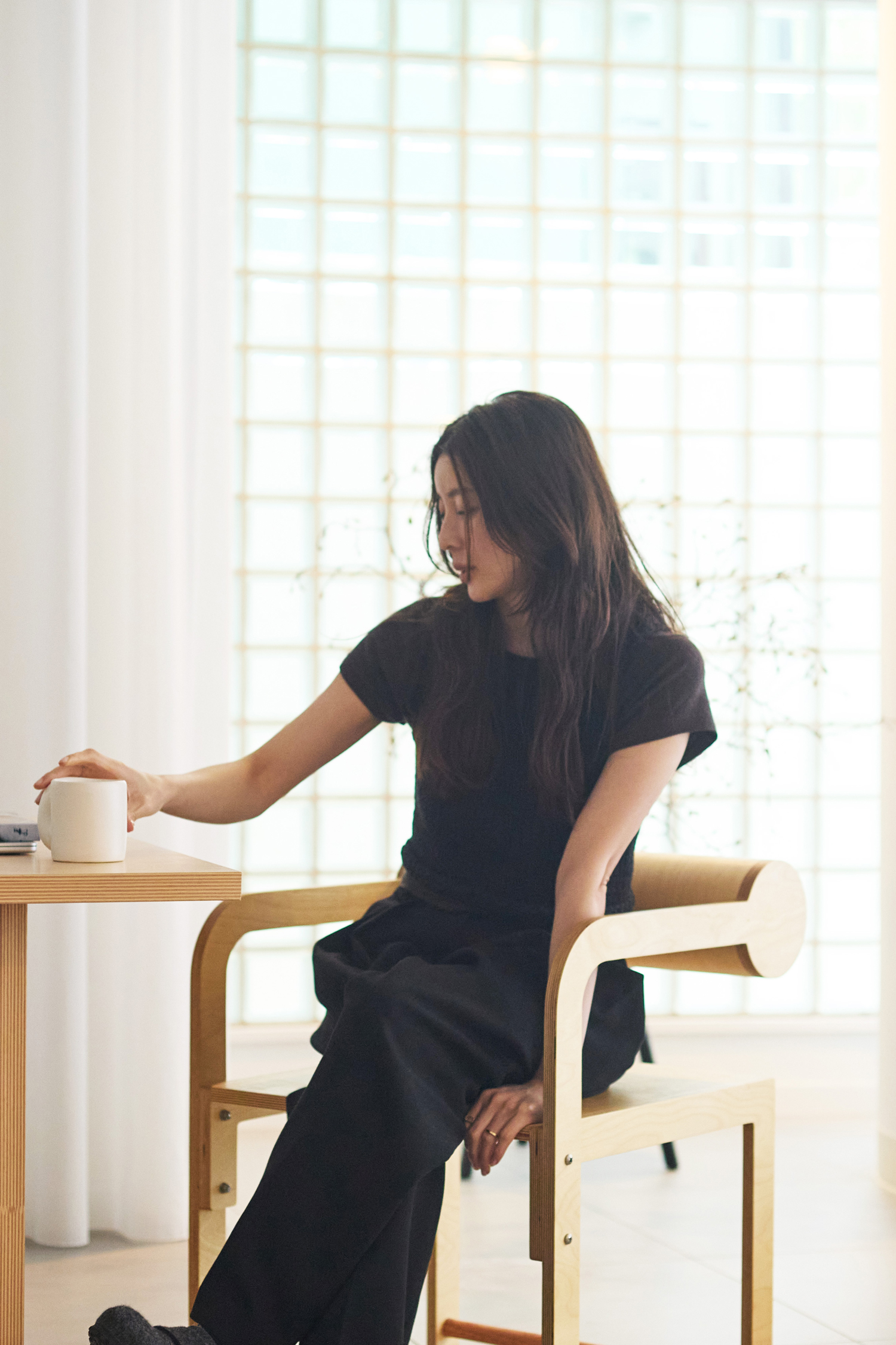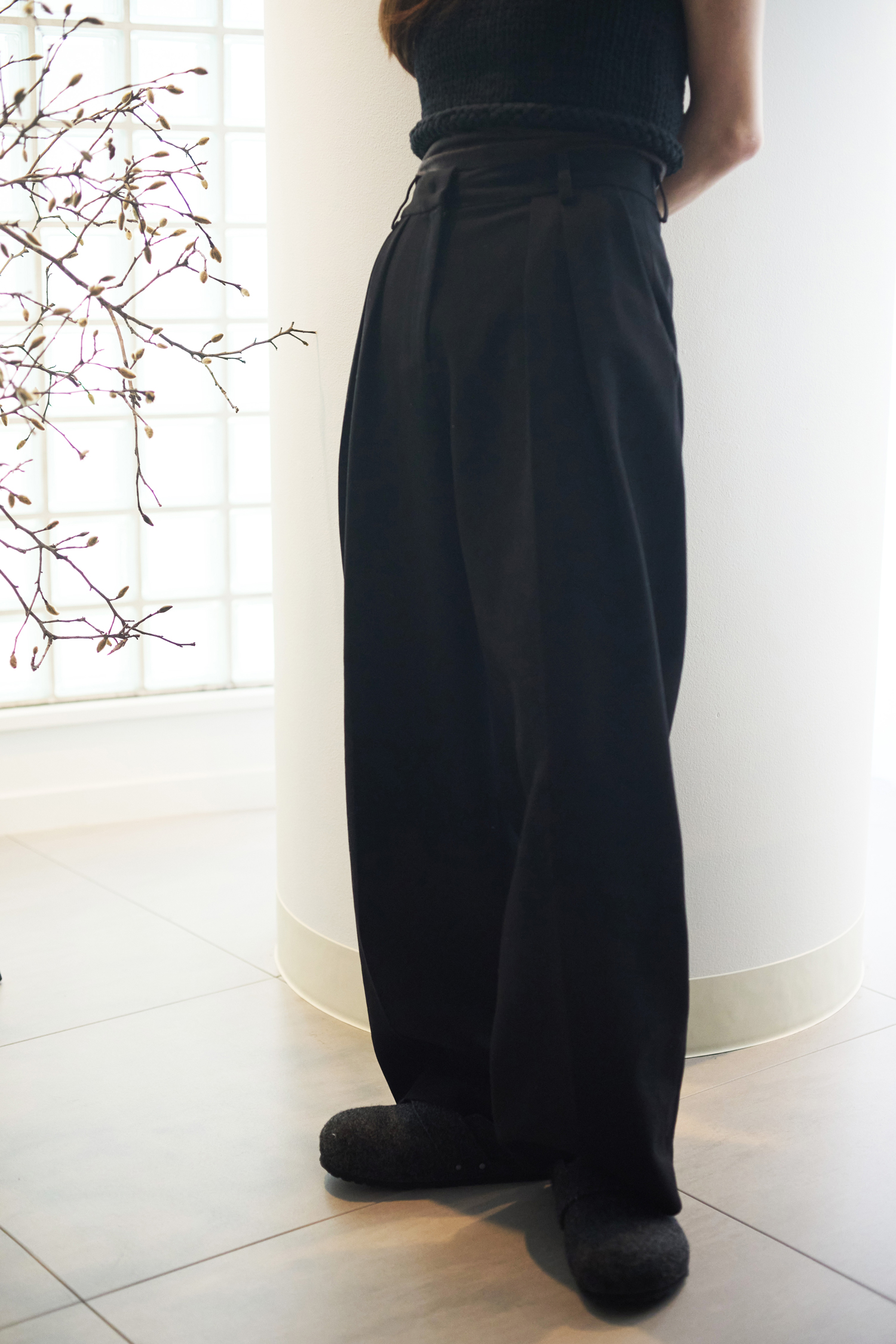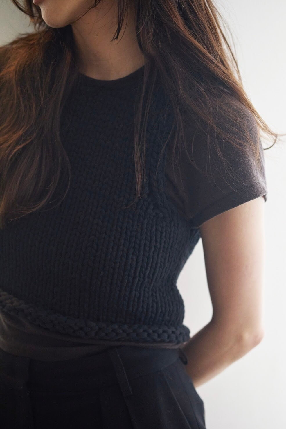 太めの糸で編まれたニットベストは、立体感のある表情がお気に入り。一枚でさらっと着るのも好きですが、今の気分はコンパクトなTシャツとのレイヤード。ボンディングパンツは、ほぼ毎日のように手に取る定番。程よい厚みと張りがあるので、シルエットが潰れず、履くだけでスタイルが決まります。家では気張りすぎず、ダークカラーのワントーンでまとめるのが心地いい。