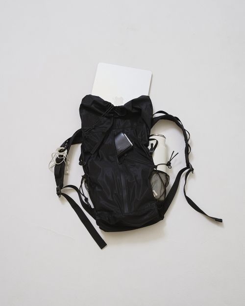 シアー感のあるリップストップ生地を使用したバックパック。軽やかな素材感に撥水加工を施し、デイリーに活躍します。内側のポケットに折りたたんで収納できるコンパクト仕様。シンプルな黒のワントーンと、アイスブルー×ブラウンの配色がポイントの2色展開で、スタイリングに程よいアクセントを添えます。耐荷重は約3kgで、毎日のスタイルに取り入れやすいサイズ感です。