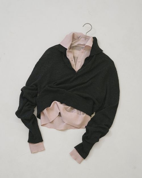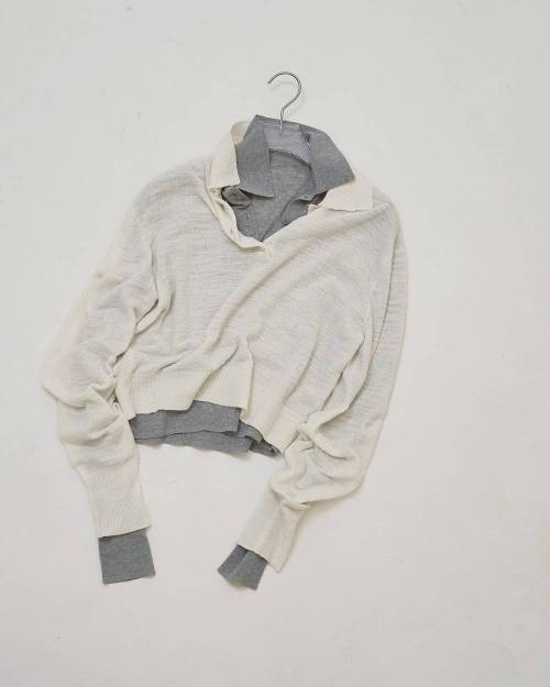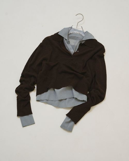 異なる糸を使用したレイヤードデザインがポイントのポロニット。配色がさりげないアクセントとなり、透け感のある編み地が軽やかさをプラス。それぞれ単品でも着用できるため、スタイリングに合わせたアレンジも可能。ほどよく抜け感のあるシルエットが、ナチュラルでこなれた雰囲気をプラスする一枚です。