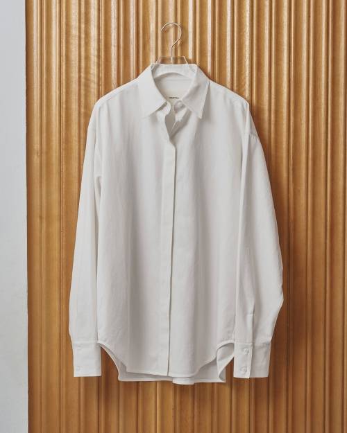 ソフトな風合いに仕上げたツイル生地を使用した、比翼仕立てのシャツ。ゆったりとしたシルエットに、ステッチを極力抑えたミニマルなデザインが洗練された印象を与えます。ボトムスのシルエットを選ばず、様々なスタイリングに馴染むアイテムです。一枚でさらっと着るのはもちろん、インしてベルトを効かせたマニッシュな着こなしもおすすめです。