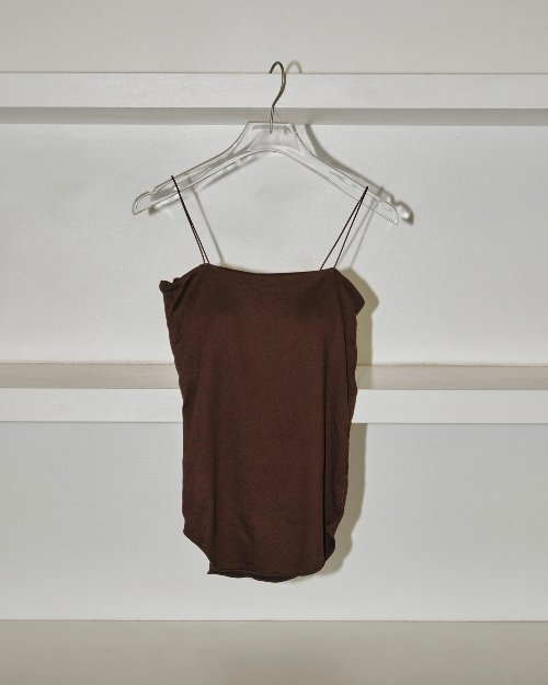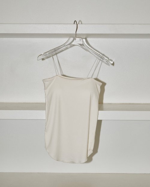 上品な光沢があり肌触りのいいカットソー生地を使用したキャミソール。トップスにラインが響きにくいすっきりとしたシルエットが魅力の一枚。華奢なストラップと直線的なネックラインはヘルシーな印象に。透け感のあるトップスや背中のあいたワンピース等のインナーにおすすめです。パットは縫いつけてあります。