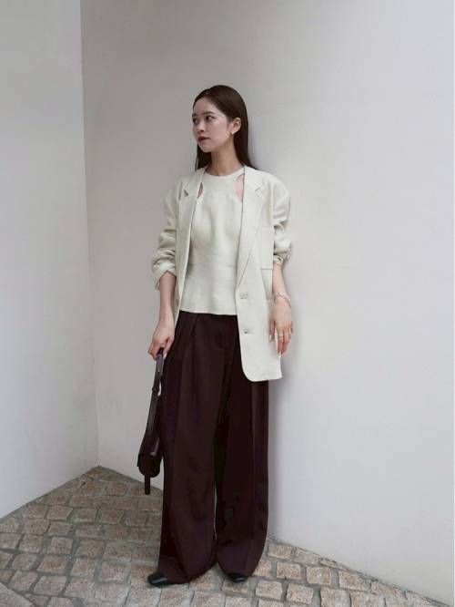 国内の上質な生地を使用したトラウザーズ。ウールのような上品でなめらかな風合いながら、ポリエステルを多く使用しているので、長いシーズン快適に着用できます。程よいシャリ感があり、ワイドシルエットでも軽やかにまとまるのが魅力。シンプルなデザインでどんなスタイリングにも馴染む一枚です。