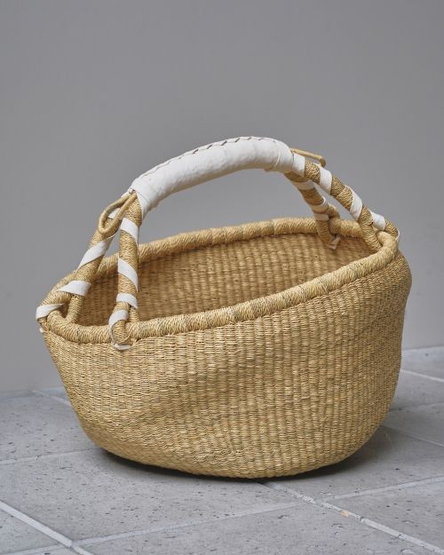 エレファントグラスと呼ばれる、丈夫な水草で編まれたインテリアかご。ガーナのボルガ地方で編み、ブルキナファソでハンドルの革を巻いています。バスタオルやスリッパなど、見せる収納におすすめな高級感のある逸品。