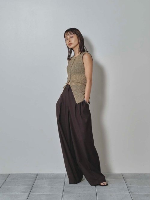 微細なリネン混の糸を使用して編まれたニットベスト。シワ加工を施すことで生まれるナチュラルな凹凸感が、奥行きのある表情を演出。華奢なボタンや細身の前立てなど、ディテールにこだわったデザインが女性らしさを引き立てます。前後どちらでも着用できる2way仕様で、ボタン側を後ろにするとすっきりとした印象に。その日の気分やスタイリングに合わせて、着こなしの幅が広がる一枚です。