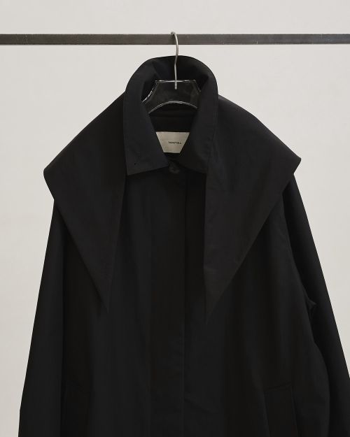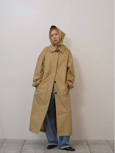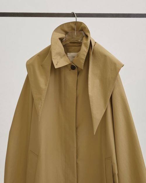 国内のナイロン100%生地に防水加工を施したコート。軽やかな着心地ながら雨風をしっかりカバーしてくれる一枚です。同素材のスカーフは、首に巻いたり頭にかぶせたりとアレンジ自在。襟を立てて着用すれば、雨の日のスタイリングにも安心感をプラスさせてくれます。ステンカラーとオーバーシルエットのバランスが抜け感を演出し、シーズンレスで活躍するアイテムです。