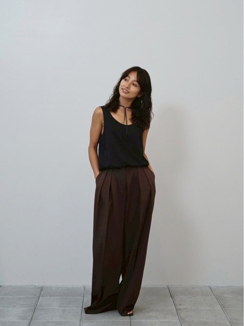 国内の上質な生地を使用したトラウザーズ。ウールのような上品でなめらかな風合いながら、ポリエステルを多く使用しているので、長いシーズン快適に着用できます。程よいシャリ感があり、ワイドシルエットでも軽やかにまとまるのが魅力。シンプルなデザインでどんなスタイリングにも馴染む一枚です。