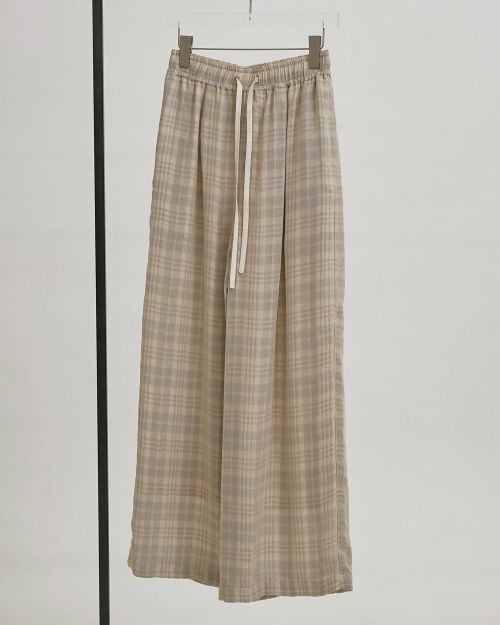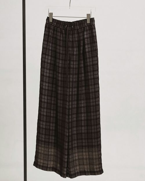 国内で織り上げたオリジナルのジャガード生地を使用したパンツ。チェック柄にチュールを重ねたような、奥行きのある表情が魅力。ウエストはゴム仕様でリラックスした履き心地。シンプルなトップスに合わせるだけで、コーディネートに程よいアクセントを添えてくれる一枚です。