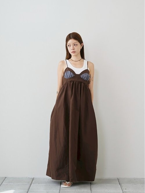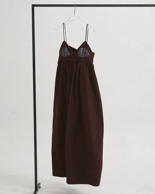 しっかりとしたハリのある生地を使用したドレス。トップはビスチェ仕様で、胸元のギャザー入りの別布がさりげないポイント。胸下から贅沢に生地を使用したバルーンシルエットが女性らしい印象を演出します。同素材の華奢なストラップは結んで長さを調整可能で、背中が見えるカットデザインも魅力。存在感があり、一枚で様になるドレスです。
