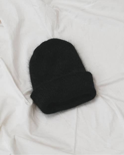 アンゴラ糸を使用したビーニー。毛足の長いアンゴラを使用しており、見た目も被り心地も暖かく、コーディネートのポイントになるアイテム。