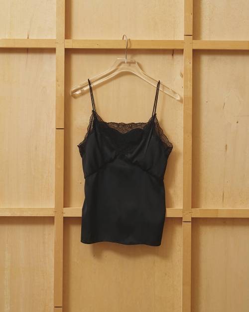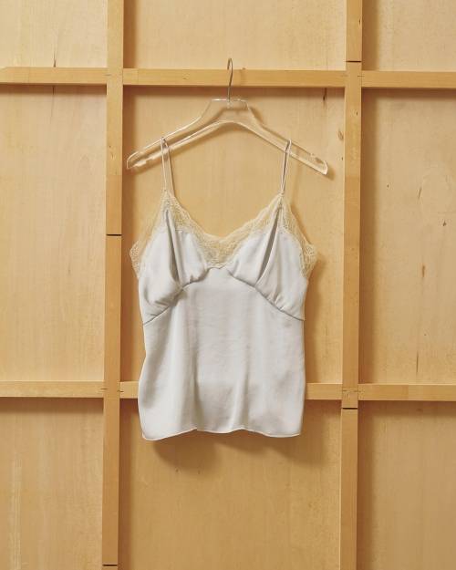 国内の上質なサテン生地を使用したキャミソール。程よい光沢感を持ちながら、肌に馴染むソフトな風合いが魅力です。ヴィンテージ加工を施し、表情のある繊細なニュアンスをプラス。程よいハリ感をもたせることで身体のラインを拾いすぎず、美しいシルエットを演出します。胸元に施したタックとギャザーがさりげない立体感と女性らしさを引き立て、繊細で高級感のあるレースがミニマルな中に上品な華やかさを添える一枚です。