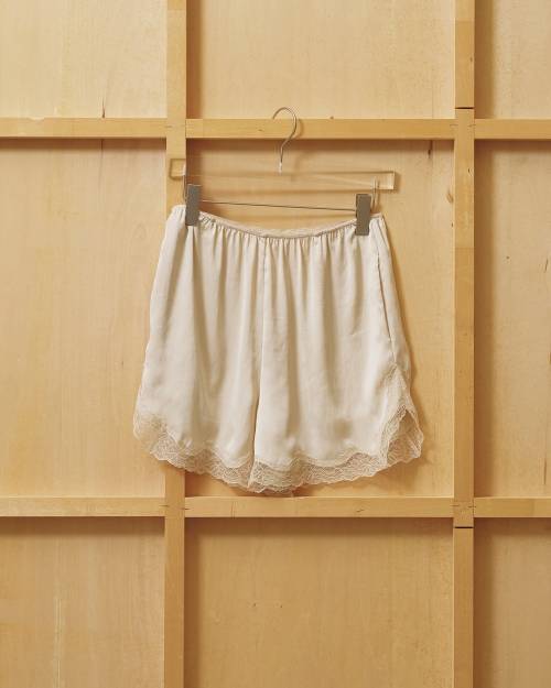 国内の上質なサテン生地を使用したハーフパンツ。程よい光沢感を持ちながら、肌に馴染むソフトな風合いが魅力です。ヴィンテージ加工を施し、表情のある繊細なニュアンスをプラス。程よいハリ感をもたせることで身体のラインを拾いすぎず、美しいシルエットを演出します。繊細なレースゴムを用いたウエストデザインや高級感のあるレースが、ミニマルな中に品のある華やかさを添える一枚です。