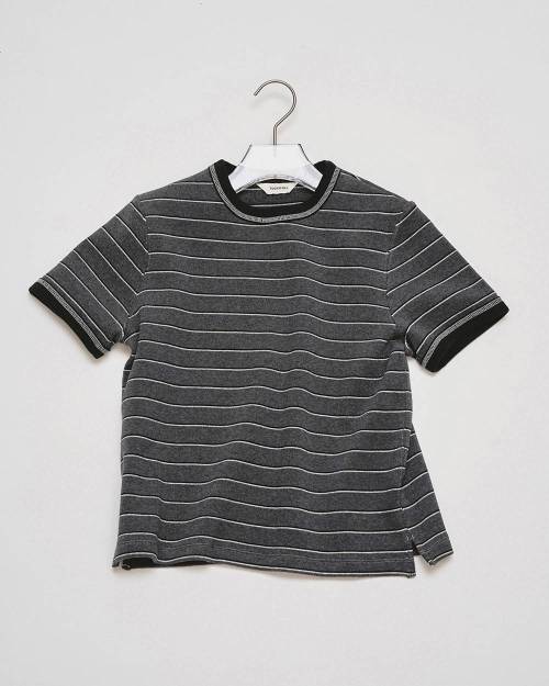 国内のオリジナルで編み上げたコットン混生地を使用したTシャツ。ポロシャツ生地のような立体的な編み目とさらっとした肌触りが特徴。それぞれ3色の糸を組みあわせた深みのある色味で、コンパクトなサイズ感に仕上げた一枚。