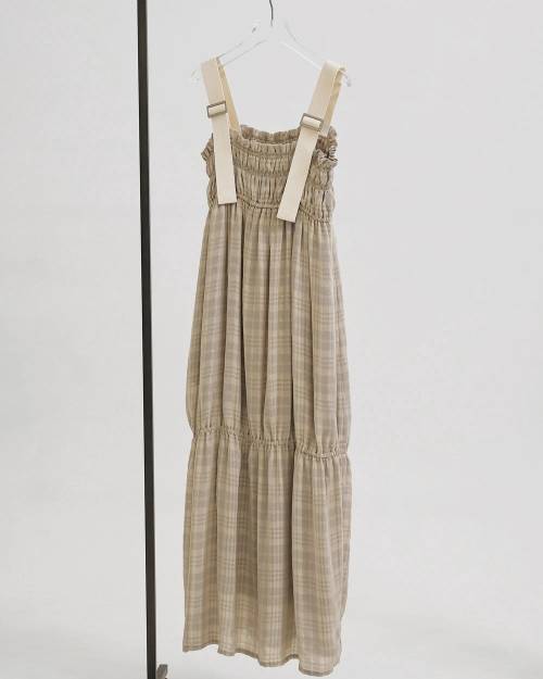 国内で織り上げたオリジナルジャガード生地を使用したドレス。チュールが重なったような奥行きのあるチェック柄が、さりげない存在感を演出。太めの肩ストラップとのバランスも絶妙で、シンプルなスタイリングでも様になる一枚です。タイトなカットソーとのレイヤードはもちろん、一枚で軽やかに着ていただくのもおすすめ。新色のセージを加えた2色展開です。